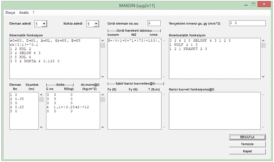 MAKDiN düzlemsel mekanizmalarda kinematik, kinetostatik, gerilme, dinamik hareket, volan, sarsma kuvveti, dengeleme ve titreşim yalıtımı hesapları yapan bir Windows yazılımıdır.
