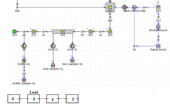 One-dimensional gas dynamics engine simulation software, the use of which is routine in the automotive industry for engine performance predictions, may be used to compute the microphone signals required by the above described source measurement methods. For example, Figure 3 shows the exhaust section of a GT-Power model of a turbocharged engine, which is setup for outputting the microphone signals required by the tests. Also shown in the figure is the block diagram model of the measurement setup, which is used for the calculation of the equivalent source characteristics in ADEM.