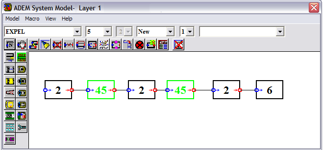 Block diagrams of UserMacros (1-D or 3-D) are constructed in sublayers of SMI. For example, Figure 3 shows a block diagram of the UserMacro which models the rear muffler in Figure 1. A UserMacro becomes active when it is linked to its sublayer. Then the color of its sides turns bright green. A UserMacro [45] does not require any data input. UserMacroX [35] is the same as UserMacro [45] except that it has its layer number as input parameter. This enables running of different subsystem prototypes in batch.