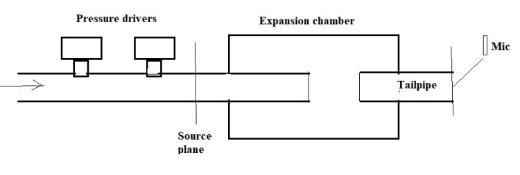 If a duct system is driven by a one-port source, the program assumes that it is applied at the inlet node of the system, which is defined as the unconnected inlet node on the source side of the block diagram in layer 1. For example, in Figure 2 the source is applied by the implicit method at the inlet node of element 2, which corresponds to the inlet of the circular muffler in Figure 2.